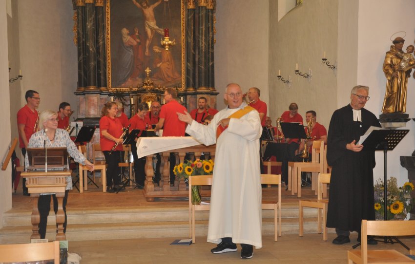 (sw) Der diesjährige ökumenische Schulstartgottesdienst fand wegen den schlechten Wetterprognosen in der katholischen Kirche in Hornussen statt. Umrahmt wurde die Feier von der Musikgesellschaft Hornussen. Gestaltet wurde sie von Pfarrer Volker Houba, Diakon Andreas Wieland und der Katechetin Sabine Wülser. Die Thematik: «ANGST? – MIT VERTRAUEN INS NEUE SCHULJAHR» zog sich wie ein roter Faden mit passenden Liedern, Texten und der biblischen Geschichte: «DAVID» durch den Gottesdienst. Die beiden Kurzpredigten bezogen sich auf die David-Geschichte, mit Gottes Hilfe lassen sich alle Ängste durch Hoffnung und Vertrauen überwinden. Bei Gott ist nichts unmöglich. Alle Kinder bekamen ein «Bhaltis» Päckchen geschenkt, dass sie an die David-Geschichte erinnern soll. Am Schluss würdigte der Kirchenpflegepräsident Karl Herzog, Stefan Rönninger, der 21 Jahre den Sakristanendienst innehatte, für die jahrelange Treue. Unter klangvollen Tönen der Musikgesellschaft Hornussen endete dieser eindrückliche Gottesdienst. Anschliessend wurde bei einem Apero im Pfarreisaal das fröhliche Zusammensein mit tiefsinnigen Gesprächen rege genutzt.