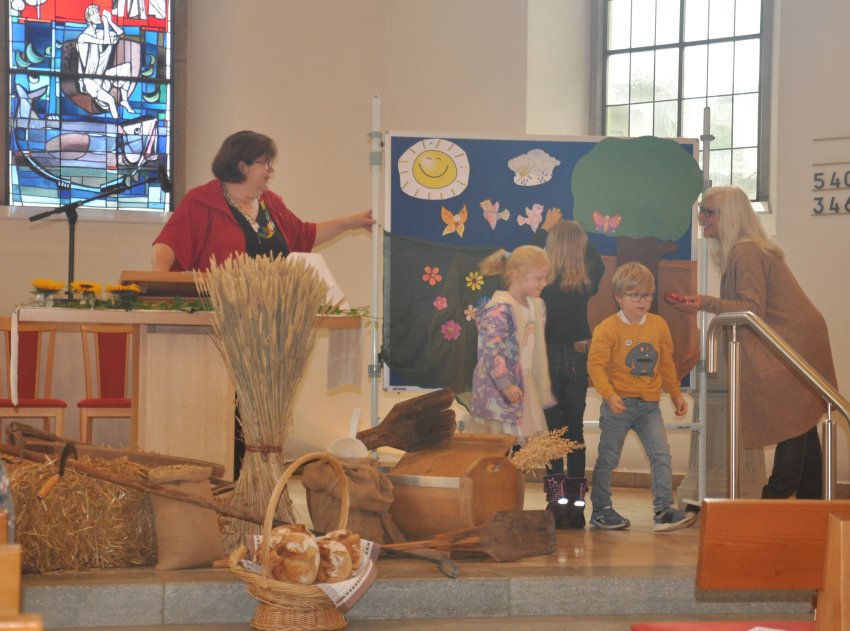 Der diesjährige Erntedankgottesdienst der reformierten Kirchgemeinde Bözen stand unter dem Thema: «staunen – danken – auftanken». Anschaulich vertieft wurde es anhand der Geschichte, «Die Ameise und das Weizenkorn», bei dem die Sonntagschülerinnen und Sonntagschüler mitwirkten. Die Kinder bereicherten den Gottesdienst mit einer Liedeinlage und den dazu passenden Bewegungen.