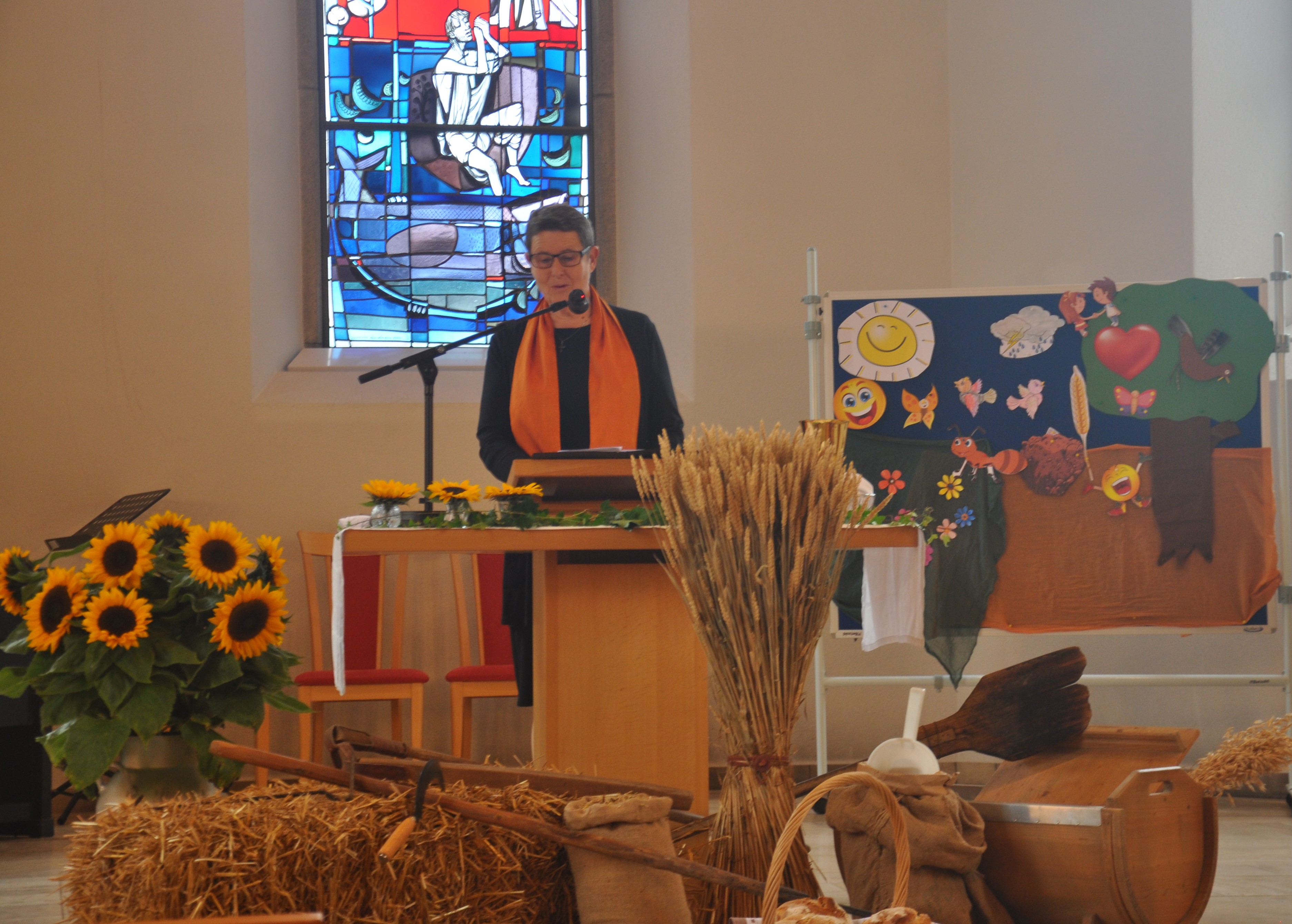 Pfarrerin Anna Schütz ging in ihrer Predigt ausführlich auf die Geschichte ein und betonte, dank des Risikos und des Vertrauens wurde die Ameise reich belohnt und staunte über die zahlreiche Vermehrung des Weizenkorns. Es hatte sein Verspre-chen eingehalten, dass aus ihm eine neue Pflanze mit hunderten von Weizenkörnern entsteht. Dies, wenn es als Wintervorrat verschont wird und stattdessen als Same unter der Erde liegen bleibt. Pfarrerin Anna Schütz wünschte allen ebenso Risikobe-reitschaft und grosses Gottvertrauen für den Alltag. Es war ein eindrücklicher Übergang zum Abendmahl, zu dem alle eingeladen waren.