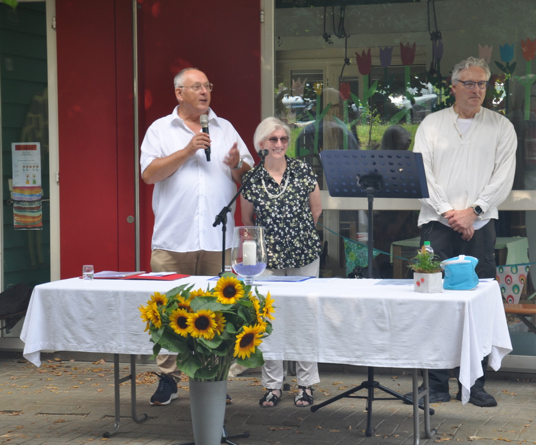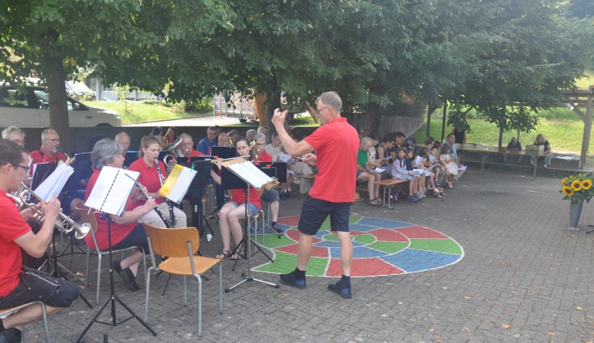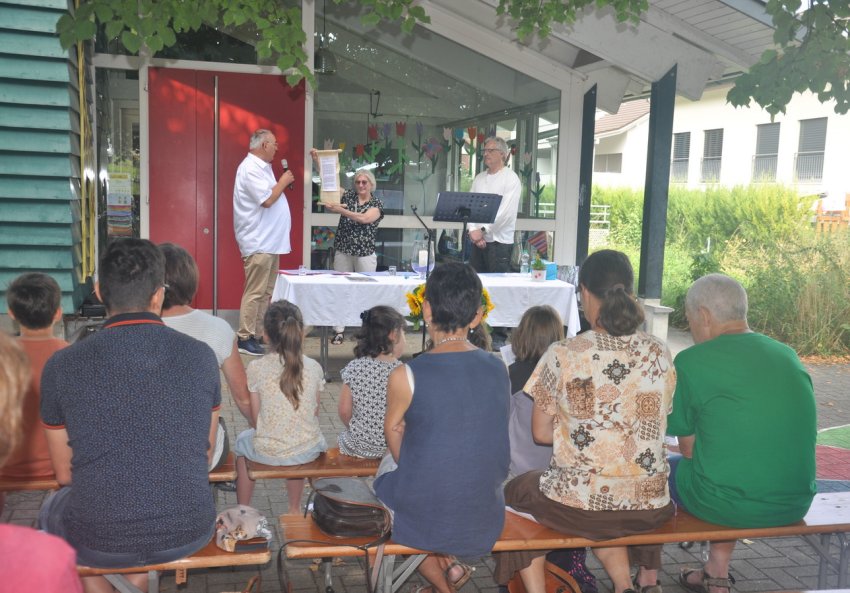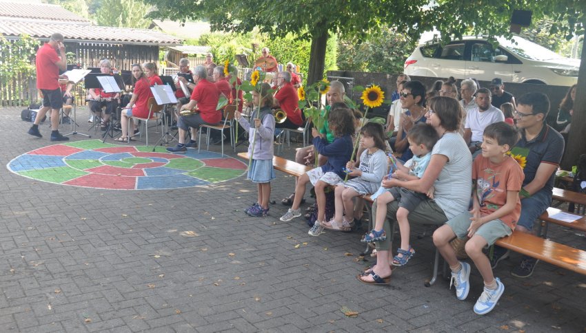 Der ökumenische Schulstartgottesdienst fand dieses Jahr bei angenehmen Temperaturen auf dem Kindergartenplatz in Hornussen statt. Umrahmt wurde die Feier von der Musikgesellschaft Hornussen. Gestaltet wurde sie von Pfarrer Volker Houba, Diakon Andreas Wieland und der Katechetin Sabine Wülser. Die Thematik: «ICH + DU = WIR - WIR + ALLE = GEMEINSAM » zog sich wie ein roter Faden mit passenden Liedern, Texten und Geschichten durch den Gottesdienst. Die beiden Kurzpredigten bezogen sich auf die zwei erzählten Geschichten. Paulus schrieb einen Brief an die Korinther und verglich das Zusammenleben mit dem Körper, der aus verschiedenen Körperteilen besteht. Alle, vom Kleinsten bis zum Grössten, sind mit ihren Gaben, Talenten und Fantasien für die Gemeinschaft in Familie und Schule wichtig. Erst gemeinsam sind wir alle stark. Ebenso anschaulich wurde die Geschichte «Die drei Kinder» von Leo Tolstoi erzählt. Alle Kinder bekamen am Schluss ein Regenbogenfarbstift und «Smarties» als «Bhaltis», welches sie an die Vielfalt erinnert. Unter klangvollen Tönen der Musikgesellschaft Hornussen endete dieser eindrückliche Gottesdienst. Anschliessend wurde bei einem Apero das fröhliche Zusammensein mit ungezwungenen Gesprächen rege genutzt.
