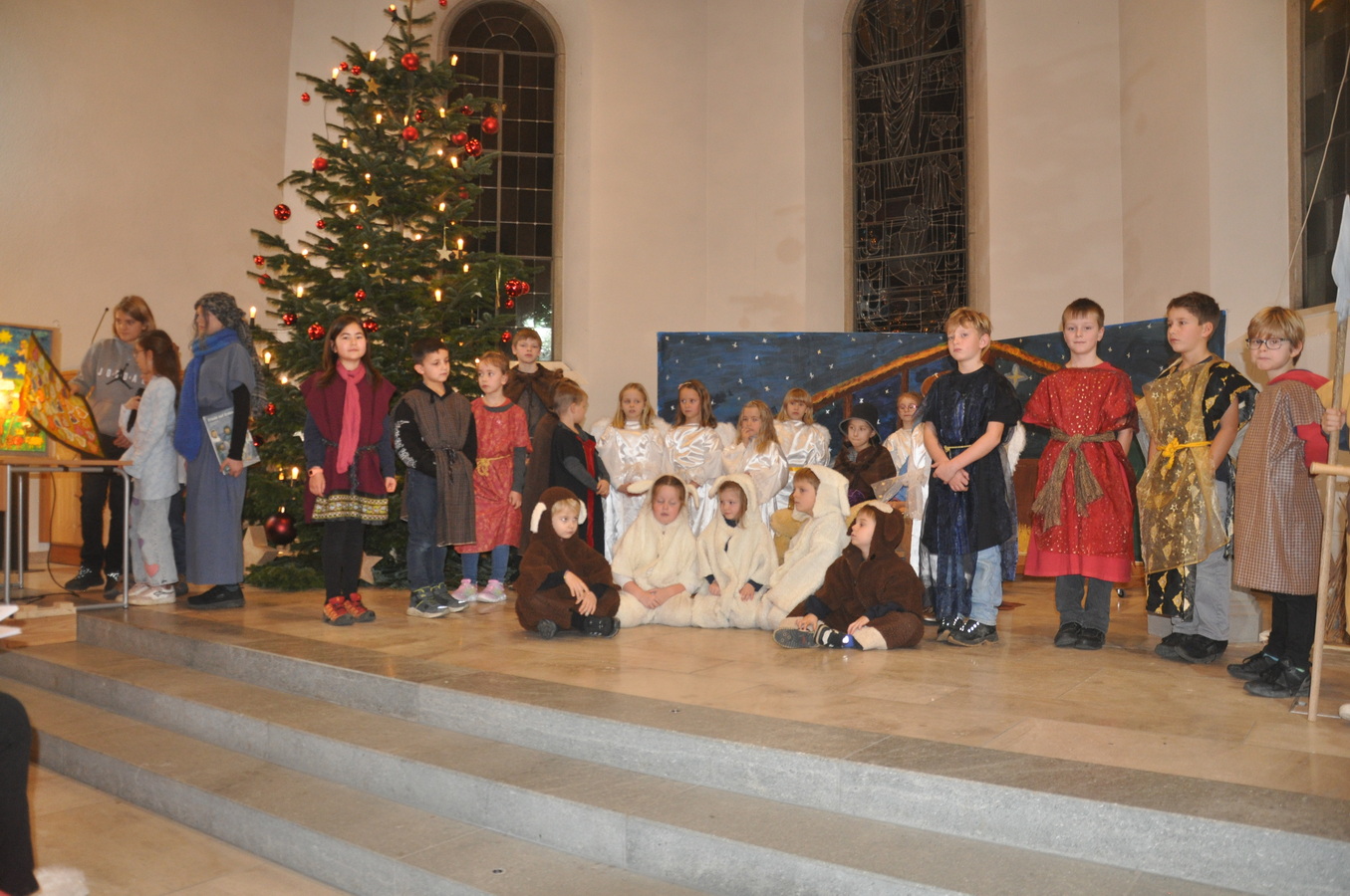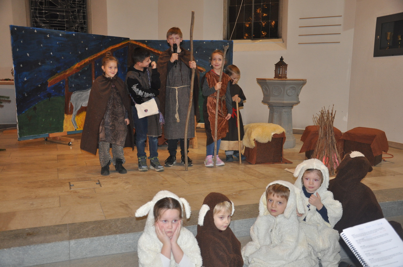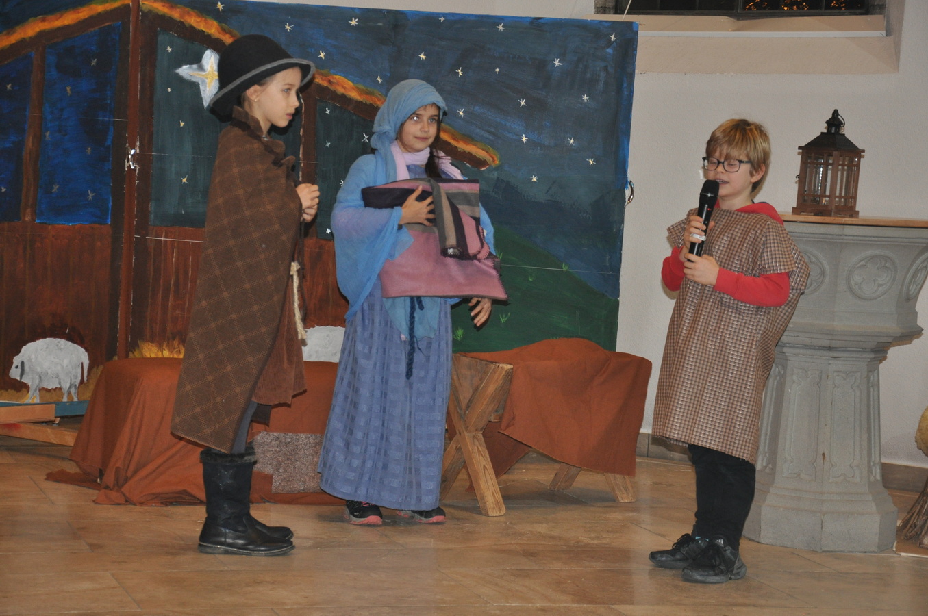 Bevor das Spiel begann, begrüsste Kirchenpflegepräsident Rene Feierabend alle Anwesenden sehr herzlich. In Vertretung des krankheitshalber abwesenden Pfarrers Volker Houba richtete er seine weihnachtliche Botschaft aus. Das Spiel wurde abwechselnd auf zwei Seiten aufgeführt. Auf der linken Seite der Szene bastelten drei Kinder mit ihrer Grossmutter eine Laterne und auf der rechten Seite wurden Szenen der Weihnachtsgeschichte aufgeführt. Zwischen den Szenen wurden jeweils die passenden Weihnachtslieder gesungen. Es war eine Freude, mit welcher Begeisterung die Kinder die Lieder vortrugen.