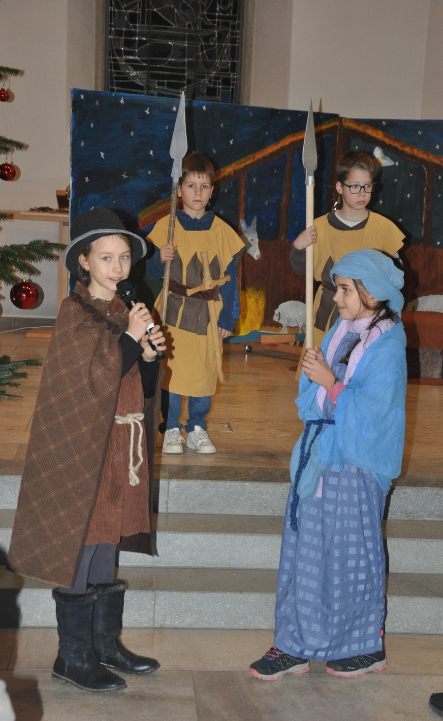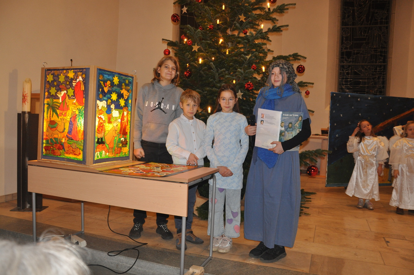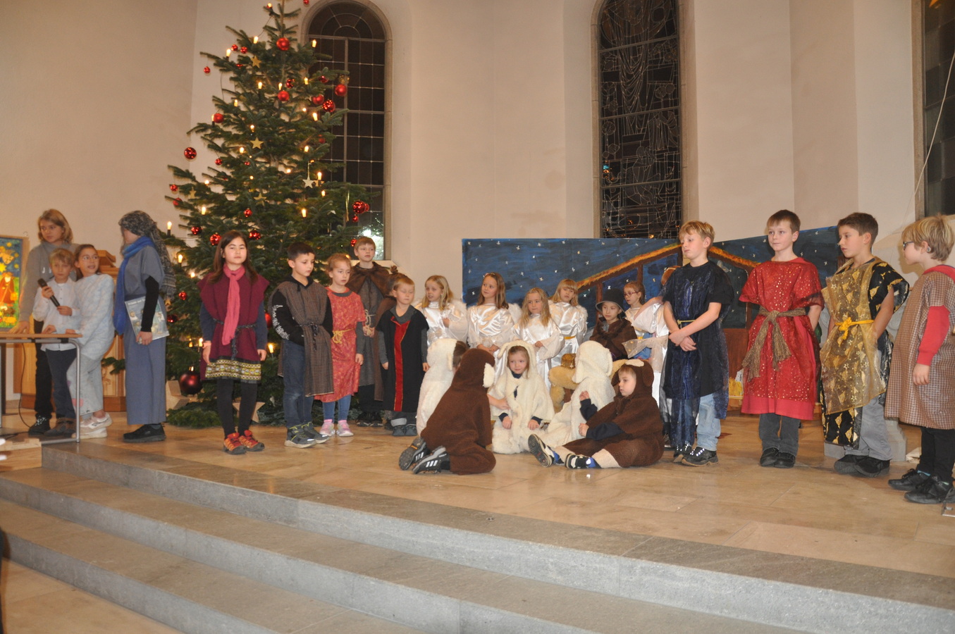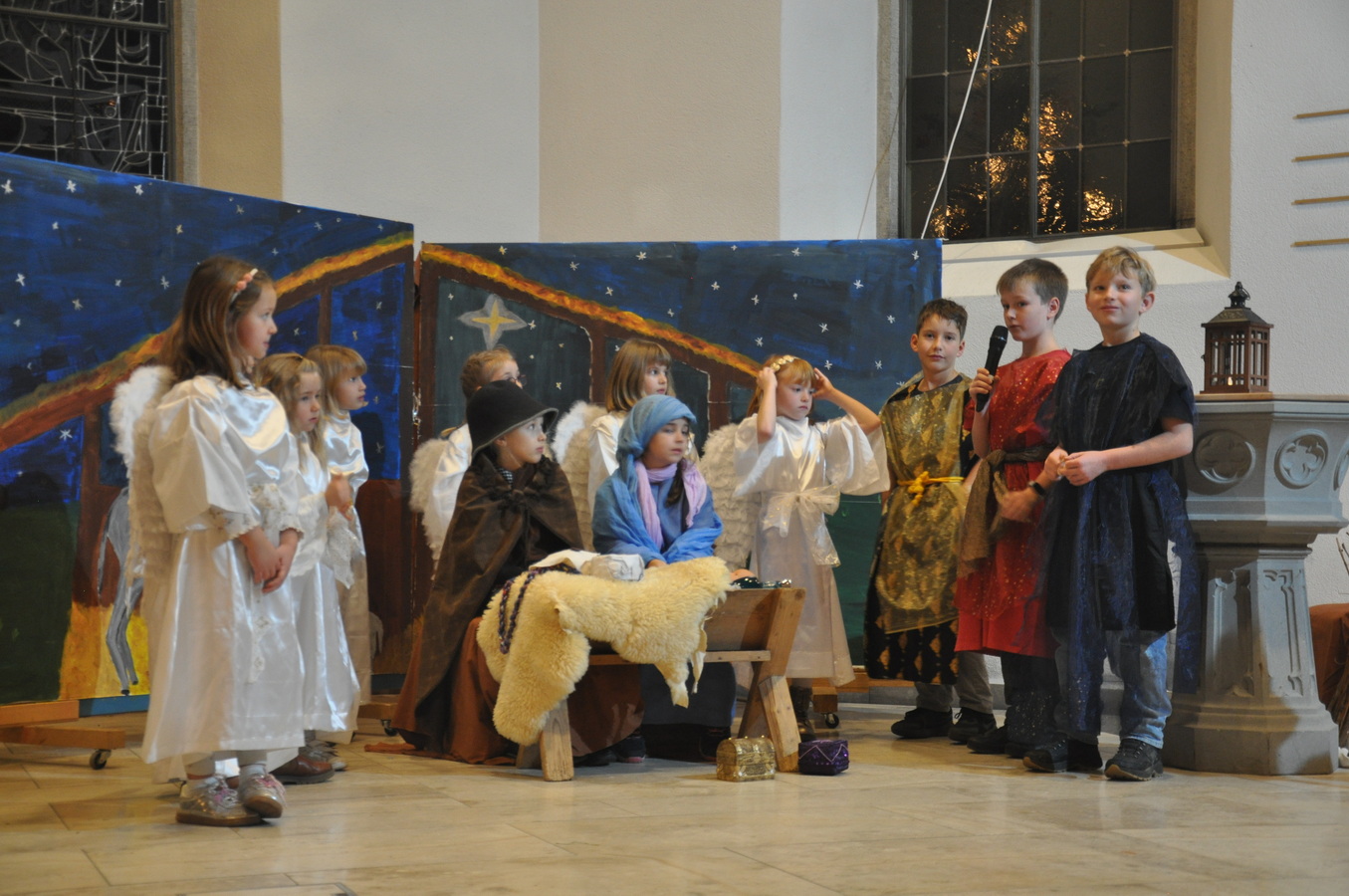 Bevor das Spiel begann, begrüsste Kirchenpflegepräsident Rene Feierabend alle Anwesenden sehr herzlich. In Vertretung des krankheitshalber abwesenden Pfarrers Volker Houba richtete er seine weihnachtliche Botschaft aus. Das Spiel wurde abwechselnd auf zwei Seiten aufgeführt. Auf der linken Seite der Szene bastelten drei Kinder mit ihrer Grossmutter eine Laterne und auf der rechten Seite wurden Szenen der Weihnachtsgeschichte aufgeführt. Zwischen den Szenen wurden jeweils die passenden Weihnachtslieder gesungen. Es war eine Freude, mit welcher Begeisterung die Kinder die Lieder vortrugen.