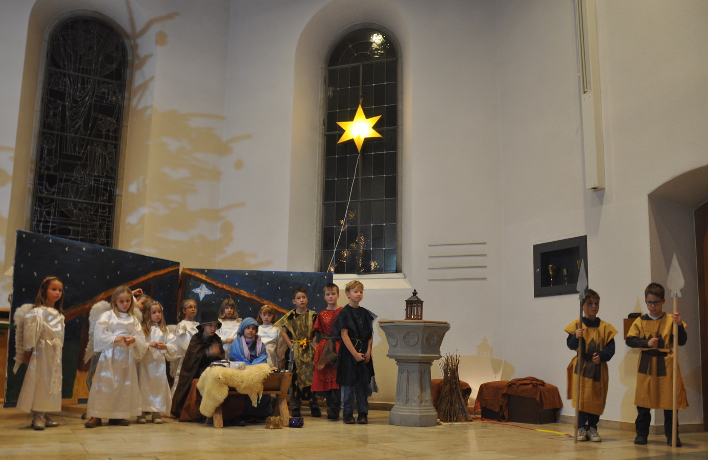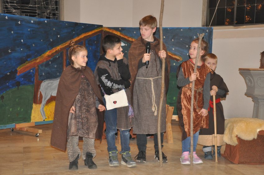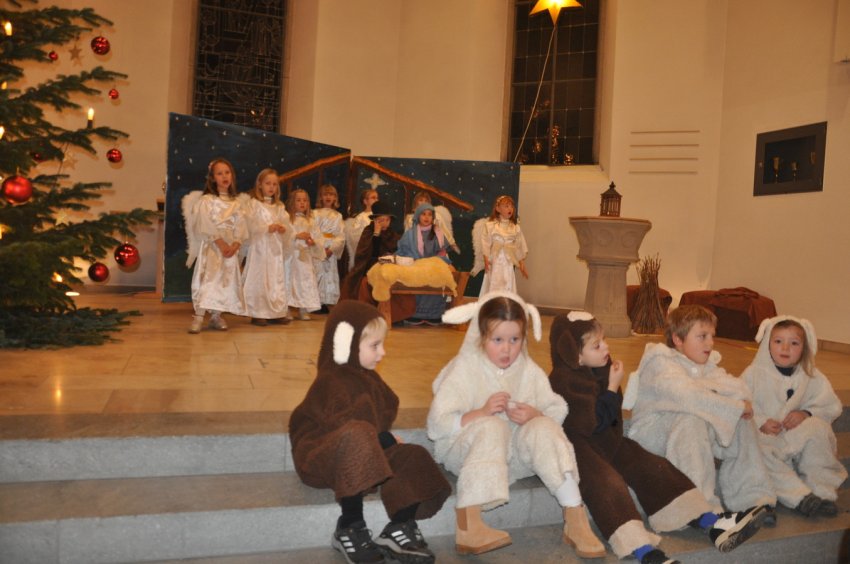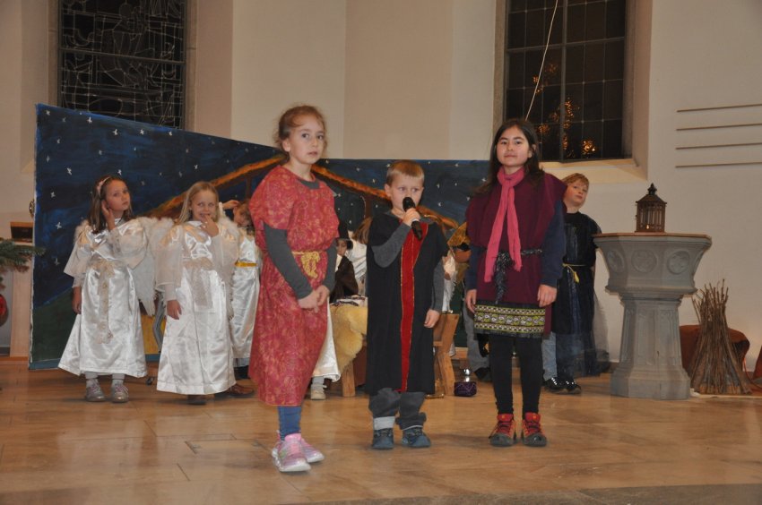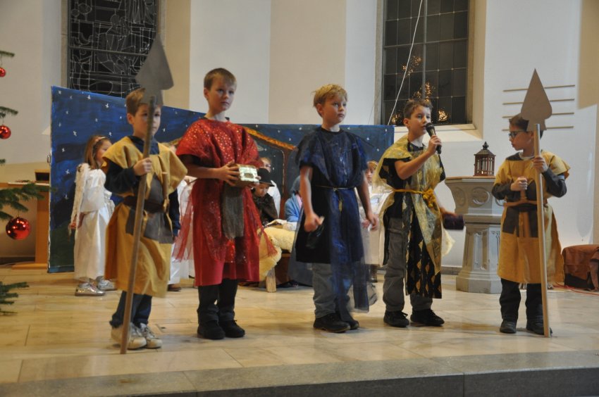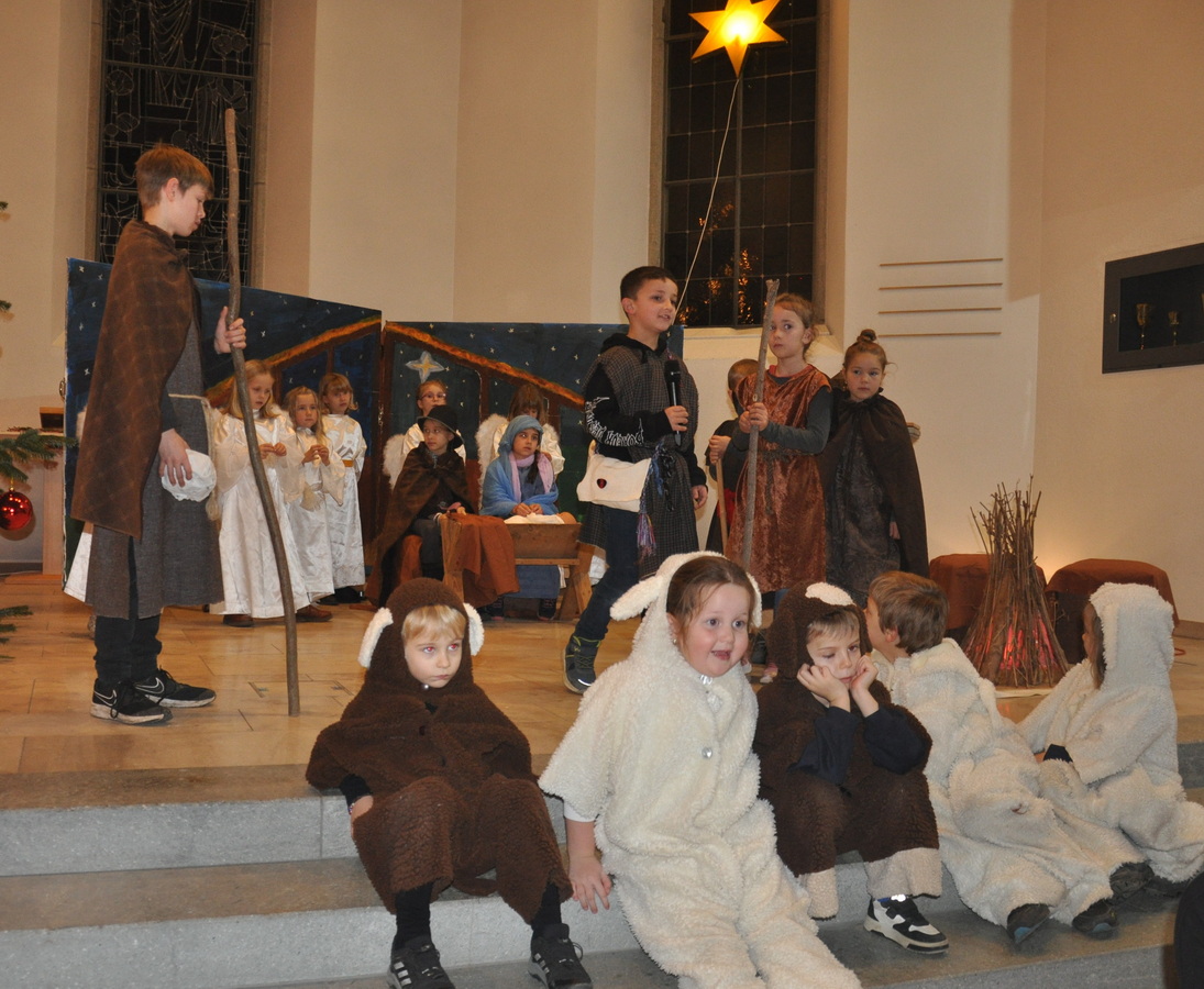 Bevor das Spiel begann, begrüsste Kirchenpflegepräsident Rene Feierabend alle Anwesenden sehr herzlich. In Vertretung des krankheitshalber abwesenden Pfarrers Volker Houba richtete er seine weihnachtliche Botschaft aus. Das Spiel wurde abwechselnd auf zwei Seiten aufgeführt. Auf der linken Seite der Szene bastelten drei Kinder mit ihrer Grossmutter eine Laterne und auf der rechten Seite wurden Szenen der Weihnachtsgeschichte aufgeführt. Zwischen den Szenen wurden jeweils die passenden Weihnachtslieder gesungen. Es war eine Freude, mit welcher Begeisterung die Kinder die Lieder vortrugen.