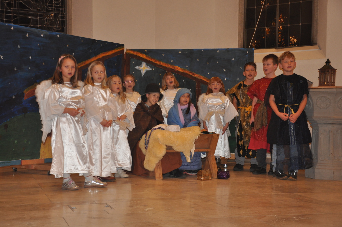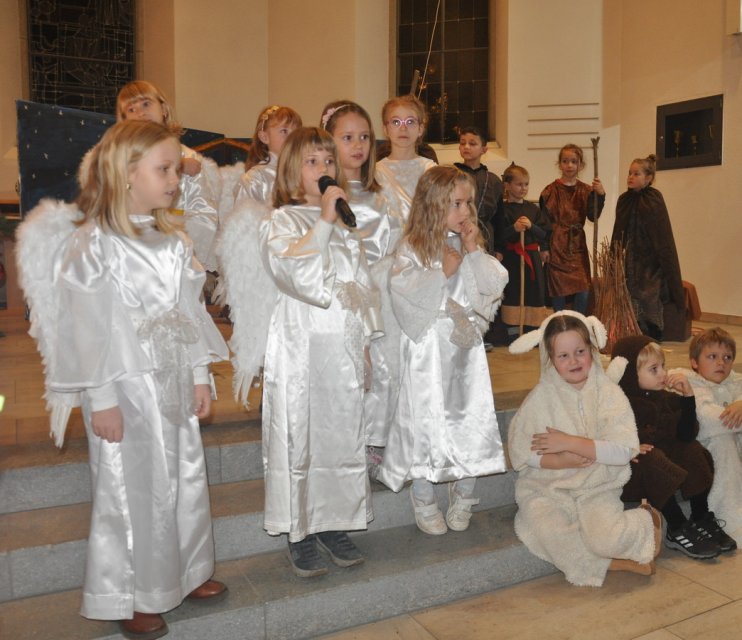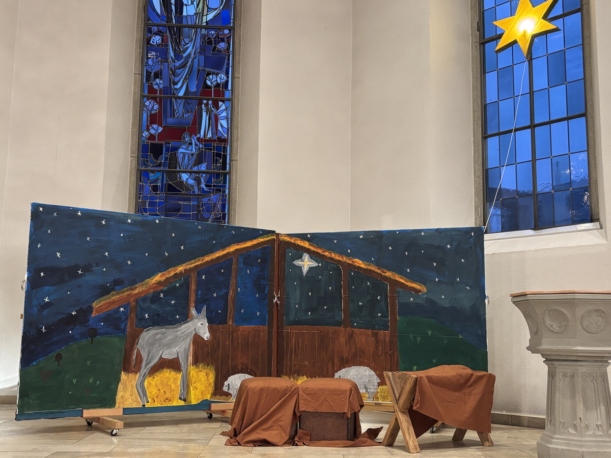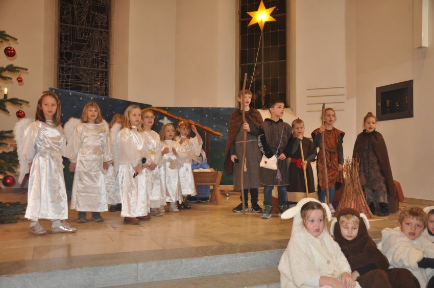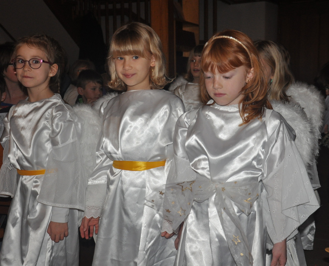 Bevor das Spiel begann, begrüsste Kirchenpflegepräsident Rene Feierabend alle Anwesenden sehr herzlich. In Vertretung des krankheitshalber abwesenden Pfarrers Volker Houba richtete er seine weihnachtliche Botschaft aus. Das Spiel wurde abwechselnd auf zwei Seiten aufgeführt. Auf der linken Seite der Szene bastelten drei Kinder mit ihrer Grossmutter eine Laterne und auf der rechten Seite wurden Szenen der Weihnachtsgeschichte aufgeführt. Zwischen den Szenen wurden jeweils die passenden Weihnachtslieder gesungen. Es war eine Freude, mit welcher Begeisterung die Kinder die Lieder vortrugen.