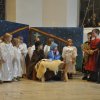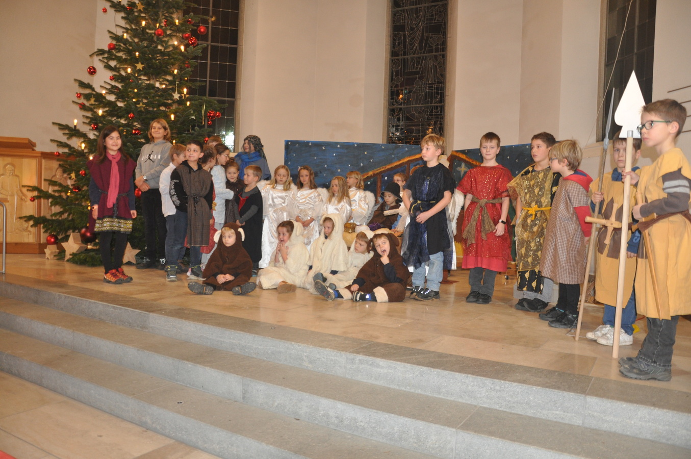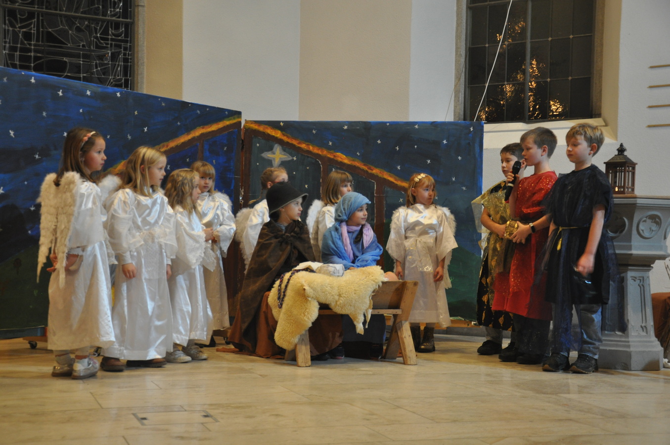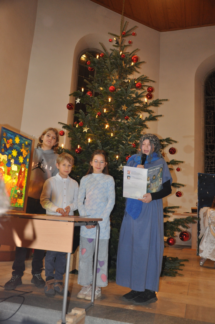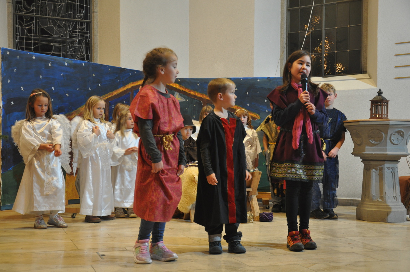Bevor das Spiel begann, begrüsste Kirchenpflegepräsident Rene Feierabend alle Anwesenden sehr herzlich. In Vertretung des krankheitshalber abwesenden Pfarrers Volker Houba richtete er seine weihnachtliche Botschaft aus. Das Spiel wurde abwechselnd auf zwei Seiten aufgeführt. Auf der linken Seite der Szene bastelten drei Kinder mit ihrer Grossmutter eine Laterne und auf der rechten Seite wurden Szenen der Weihnachtsgeschichte aufgeführt. Zwischen den Szenen wurden jeweils die passenden Weihnachtslieder gesungen. Es war eine Freude, mit welcher Begeisterung die Kinder die Lieder vortrugen.